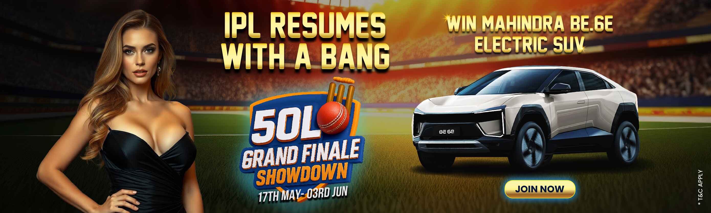 Get ready for the ultimate cricketing comeback as the IPL resumes with a bang! From 17th May to 3rd June, join the ₹50 Lakh Grand Finale Showdown. Race to the top for a chance to win the all-new Mahindra BE.6e Electric SUV and other massive cash rewards. It’s your final shot at IPL glory, don’t miss out.