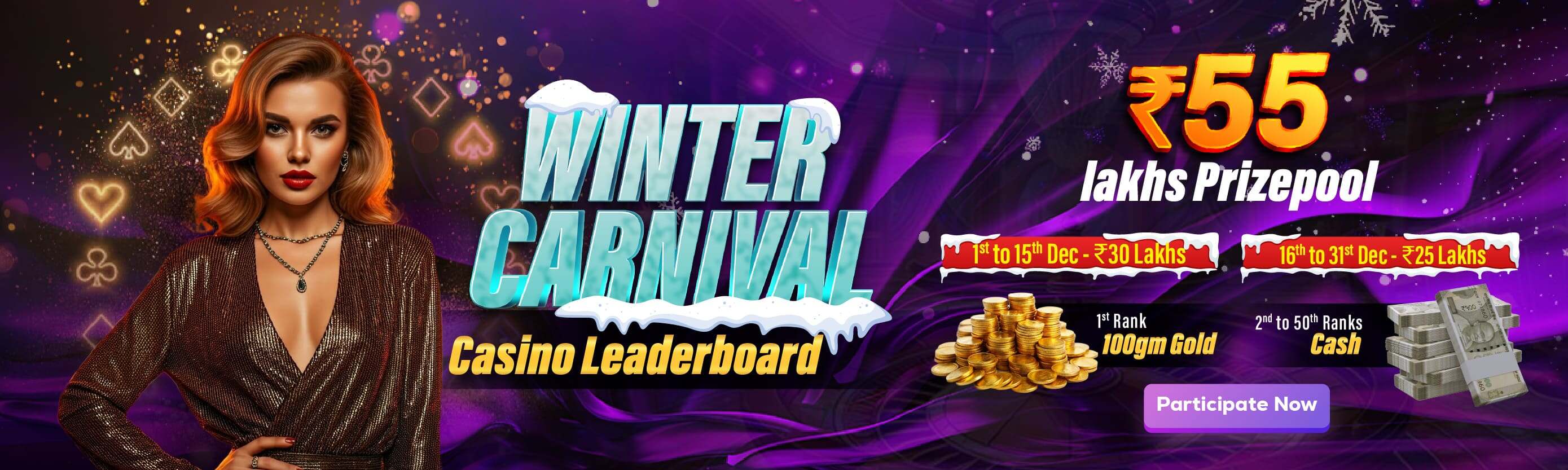 Get ready to experience the thrill of the Winter Carnival Casino Leaderboard, where an exciting ₹55 Lakhs prize pool awaits! From 1st to 15th December, compete for your share of ₹30 Lakhs, and from 16th to 31st December, grab a chance to win ₹25 Lakhs. Secure the 1st rank and take home 100gm of pure gold! Ranks 2 to 50 can win cash prizes. Don’t miss out on this golden opportunity!