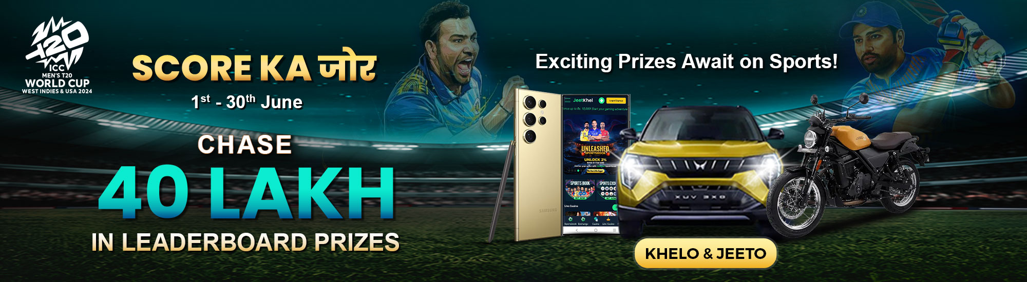 From June 2nd to June 29th, unleash your skills, bet a minimum of Rs. 1,00,000 , and shot for the top 40 winners list. With exciting prizes including the Mahindra XUV 3XO, Harley-Davidson X440, S 24 Ultra, and cash up for grabs, it's time to step onto the pitch and make your mark.